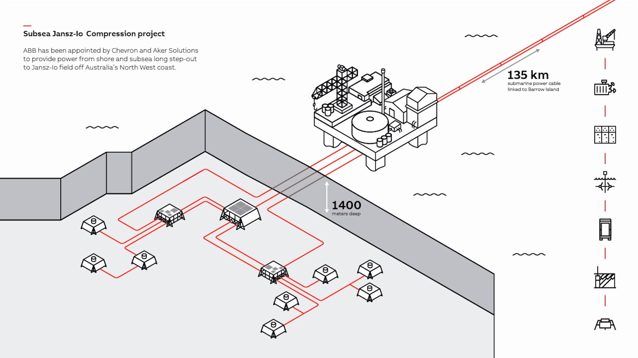 Jansz-Io 油田位于澳大利亞西北海岸離岸約 200 公里處,水深約 1,400 米。該油田是雪佛龍運營的 Gorgon 天然氣項目的一部分,該項目是世界上最大的天然氣開發(fā)項目之一。J-IC 項目將天然氣從深海輸送到海岸,這標(biāo)志著世界領(lǐng)先的海底壓縮技術(shù)第三次在全球范圍內(nèi)部署,也是第一次在挪威1之外,ABB 還負責(zé)提供 EPS。該項目將涉及建造和安裝一個 27,000 噸(上部和船體)通常無人值守的浮動現(xiàn)場控制站 (FCS)、約 6,500 噸海底壓縮基礎(chǔ)設(shè)施和一條連接巴羅島的 135 公里海底電力電纜。
