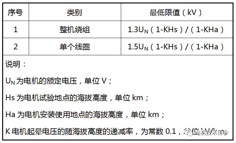 為了保證電機(jī)的質(zhì)量和性能滿足要求,一般測(cè)量電機(jī)的起暈電壓,包括定子繞組的單線圈和整機(jī)的定子繞組,并規(guī)定起暈電壓的下限值(不低于下表的規(guī)定)。